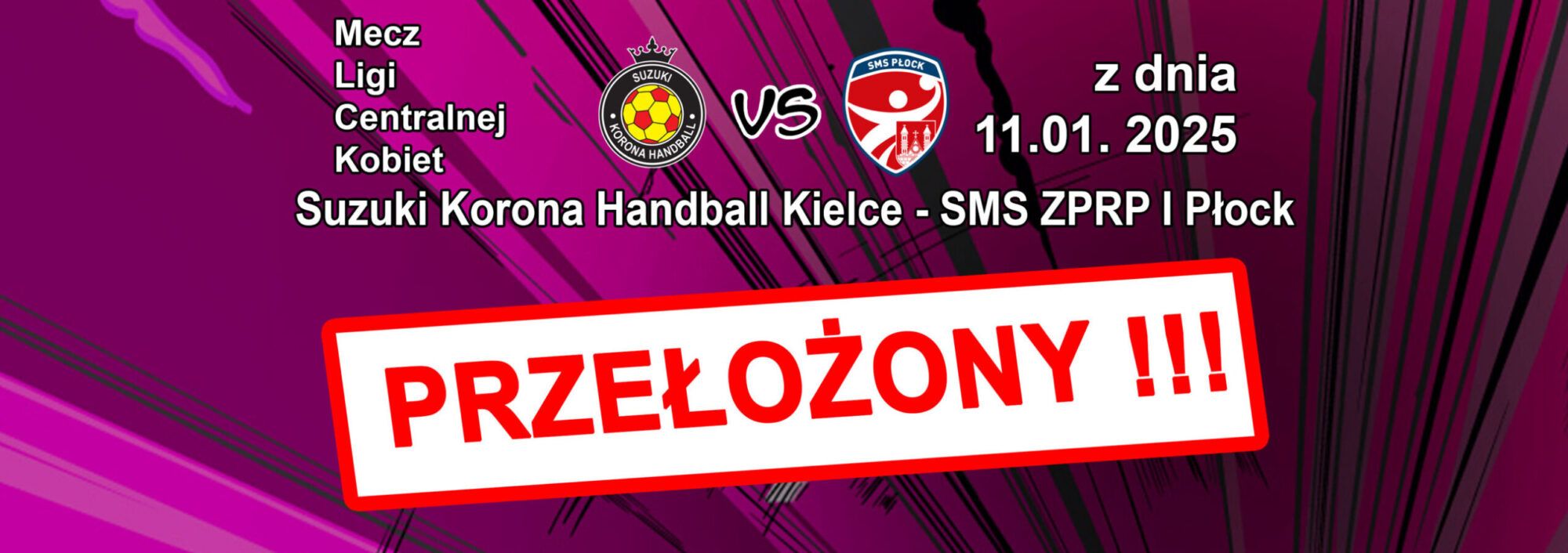 Drodzy Kibice. Informujemy iż mecz Lig Centralnej Kobiet zaplanowany na najbliższą sobotę pomiędzy Suzuki Koroną Handball Kielce a SMS ZPRP I Płock NIE ODBĘDZIE SIĘ z powodu epidemii grypy w naszej drużynie. O nowym terminie spotkania poinformujemy w najbliższym czasie.